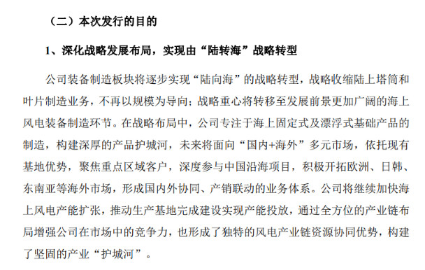 借助本次定增,天顺风能拟加码海上风电装备制造、重型海工码头及特种运输船舶等领域,在阳江、射阳等七大沿海区域布局海工基地,同时开拓欧洲等海外市场,并战略收缩低毛利陆上业务。