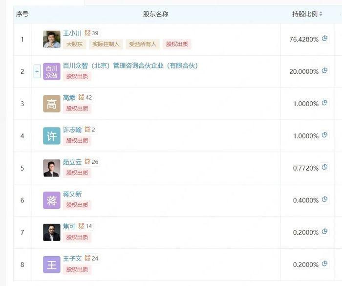 然而,曾经阻碍王小川成功的两个因素在创业百川智能时全都消失了:大模型时代,大家站在了同一起跑线,而王小川也结结实实的给自己做了一回主——他直接持有百川智能76.43%的股权,享有绝对的话语权。