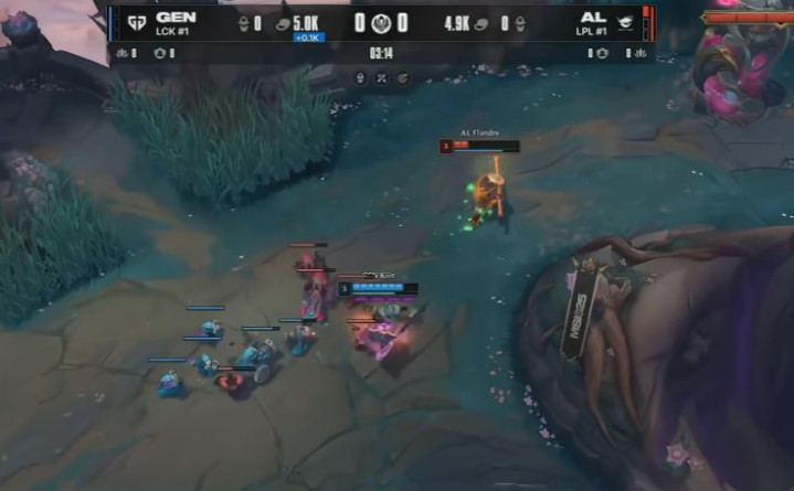 第一局,AL选择了依赖大招的进攻阵容,而GEN则构建了扎实的防守阵容。从对线阶段开始,AL展现了不逊于GEN的实力。尤其在下路交锋中,AL多次险些拿下击杀,对GEN形成威胁。Shanks的安妮对阵Chovy的阿萝拉,保持了补刀领先。在虚空巢虫团战中,Chovy因被安妮的大招被命中,血量较低,但GEN通过良好的站位扭转战局。随后,Flandre的兰博在过热状态下爆发输出,AL打赢团战。