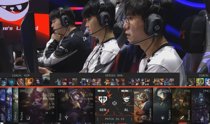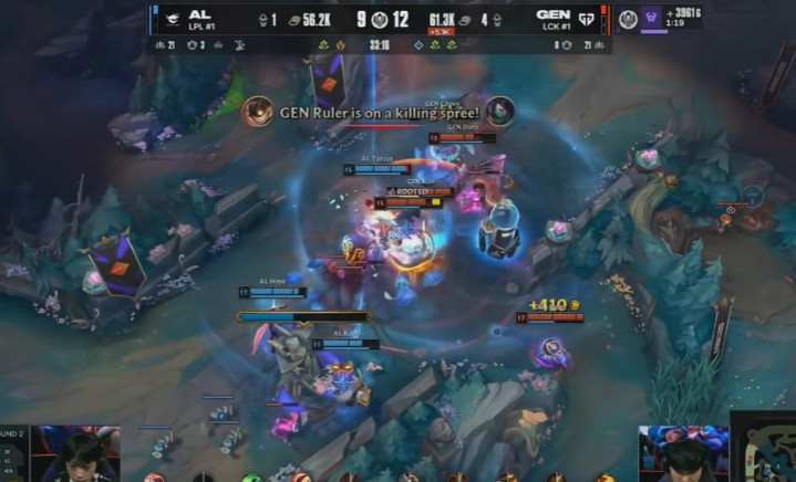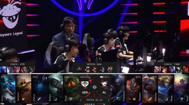 第五局开局,GEN中野联动击杀卡西奥佩娅,取得首杀。在虚空巢虫团战中,GEN精准控住AL成员进行集火击杀,大获全胜。10分钟的龙团中,Duro的布里茨连续钩中目标,GEN在早期便领先3000金币。正当GEN看似轻松取胜时,重大失误发生。GEN在对方一塔未破的情况下过于激进,追击至龙区,导致四人接连阵亡,优势在一场团战中荡然无存。尽管金币差距被追平,GEN凭借两条小龙仍占据优势。